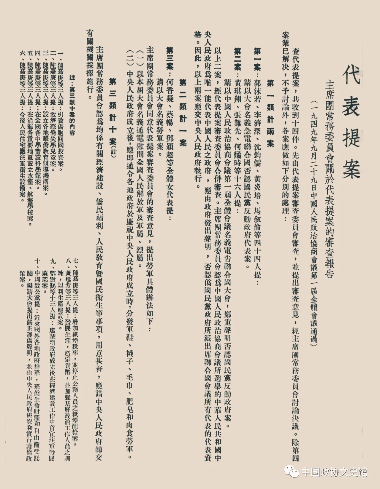 ▲1949年9月29日,中国人民政治协商会议第一届全体会议通过的代表提案。