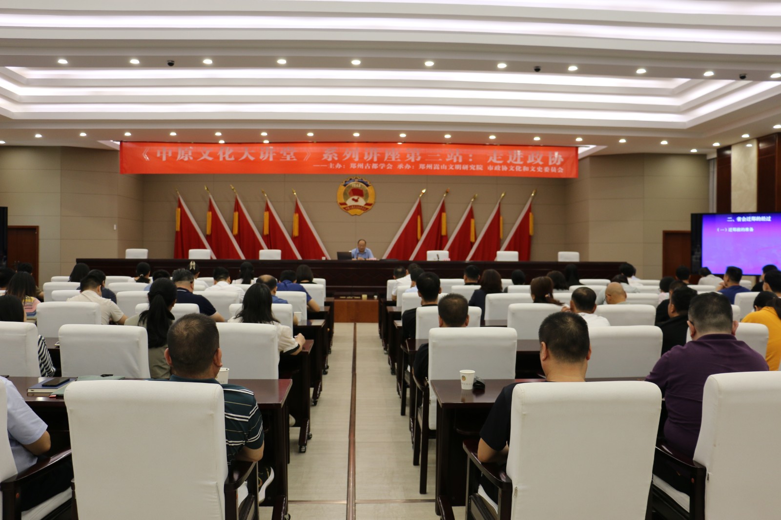 9月15日上午,《中原文化大讲堂》在郑州市政协三楼会议厅举行,本期讲座由郑州古都学会主办,郑州嵩山文明研究院、郑州政协文化和文史委员联合承办。邀请了郑州大学历史学院副院长、博士生导师谢晓鹏教授以《1954年河南省会由汴迁郑始末》为主题给大家带来了一场精彩的学术报告。部分市政协委员、民主党派及市政协机关干部参加讲座。