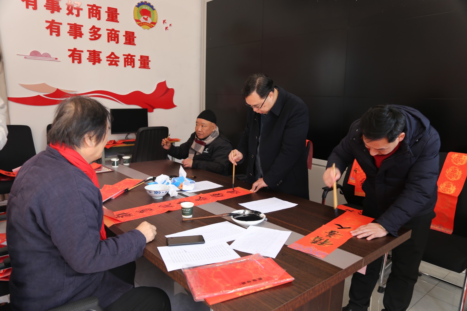 活动现场,艺术家们泼墨挥毫、题写春联,一笔一划或是端庄或是圆润,一副副苍劲有力的春联,洋溢着浓浓的年味。散发着墨香的大红春联铺满两个室内,“高居宝地财兴旺,福照家门富生辉”“年年福禄随春到,日日财源顺意来”……一副副饱含艺术家们温馨祝福的春联送到了村民手中,村民们喜悦之情溢于言表,充分展现了中华传统文化的魅力。